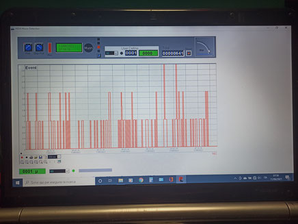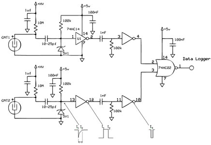 Circuito contatore di muoni modificato per Natale. Dall’uscita della logica AND viene prelevato l’ingresso per accendere luci led bianche (Muoni). Dall’uscita del trigger, si prelevano gli impulsi generati dalla radiazione Beta, o dai muoni che attraversano un singolo contatore o dal rumore; questa uscita, che conta un numero maggiore di eventi, è collegata a led colorati.