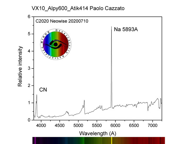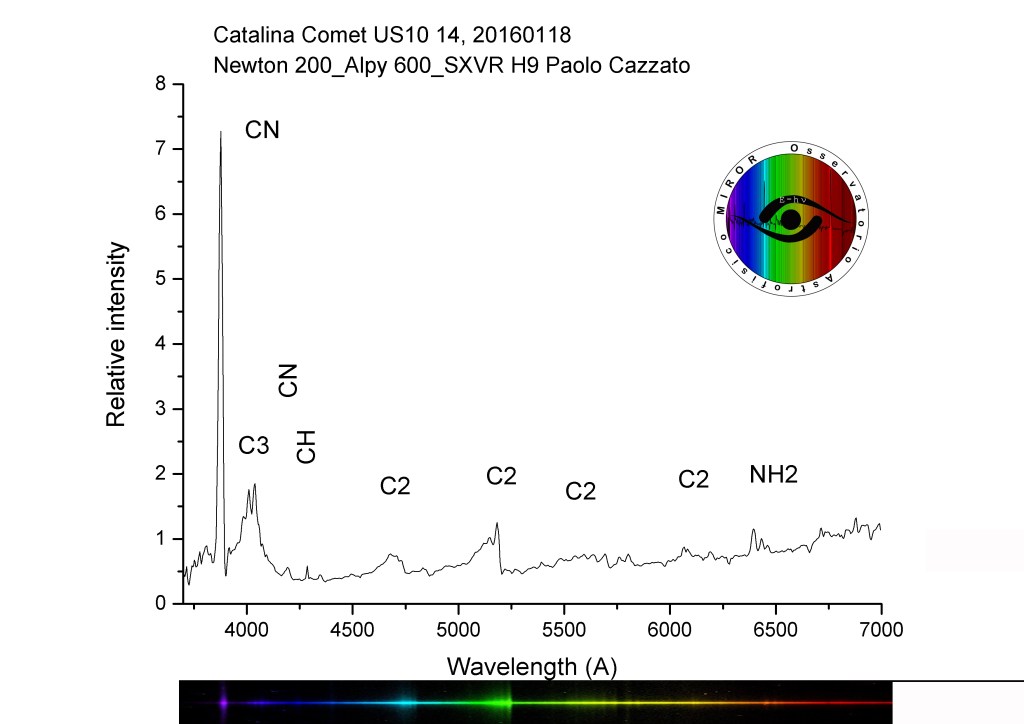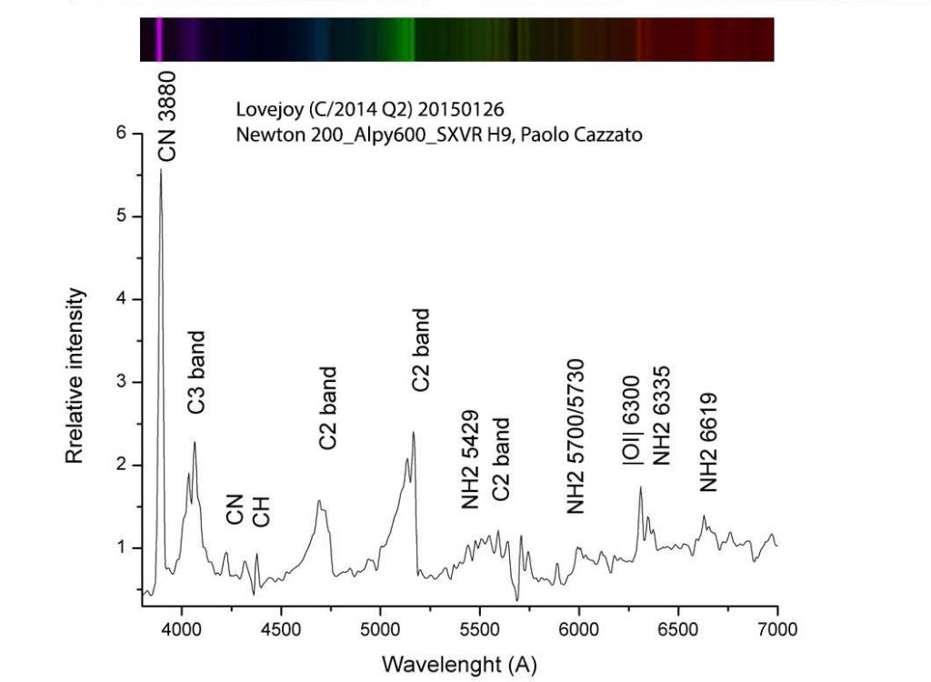 Grazie quindi all’energia fornita dal sole, la superficie si riscalda provocando la sublimazione dei ghiacci cometari che si disperdono nello Spazio e lo spettro della cometa si caratterizza di emissioni generate grazie all’eccitazione della fluorescenza solare e da processi chimici; sono visibili infatti linee di CN (cianuro), NH2, CH, C2, C3.
