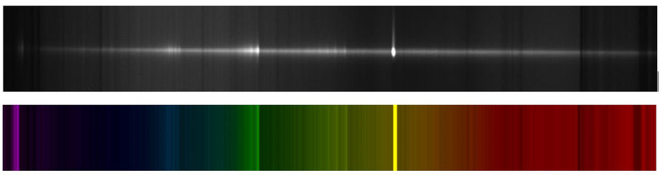 Confronto tra la dispersione della luce riflessa dal nucleo della cometa (lunghezza d’onda-spazio) e equivalente in colore dello spettro