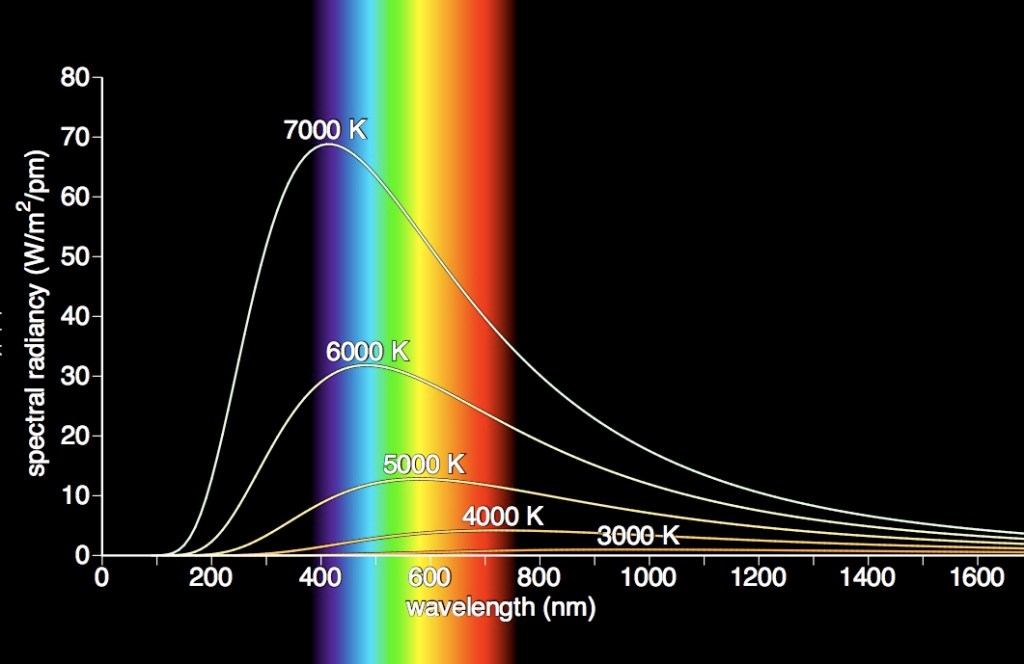 Cosa accade quando scaldiamo un metallo? E’ una risposta che conosciamo dato che lo abbiamo fatto almeno un migliaio di volte nella vita accendendo una lampada (alogena/a filamento). La corrente elettrica che passa attraverso il filamento metallico, lo riscalda fino a farlo diventare incandescente ed esso emette luce. Se potessimo dosare il calore fornito ad un qualsiasi pezzo di metallo per variare la sua temperatura, ci accorgeremmo che esso, a temperatura più bassa, appare di colore rossastro e debolmente luminoso. A temperature più alte appare decisamente luminoso e di colore giallo/bianco, fino ad apparire estremamente luminoso, e di colore bianco/ azzurro, ad elevatissime temperature. Osservando il comportamento dei corpi con la temperatura, i fisici hanno dedotto che essi, brillando, emettono uno spettro continuo la cui intensità relativa dei diversi colori cambia al variare della temperatura. Un discorso analogo si può proporre per spiegare la relazione colore-temperatura delle Stelle, anche se esse sono costituite da gas ad altissima densità estremamente caldi. Si può, infatti, affermare che una Stella molto luminosa e azzurra ha una superficie più calda di una rossa e poco luminosa. Questo fenomeno è modellizzato attraverso il corpo nero e descritto analiticamente dalla legge di Planck. Tale legge correla lo spettro di radiazione emesso dal un corpo nero a diverse temperature come mostrato in figura.