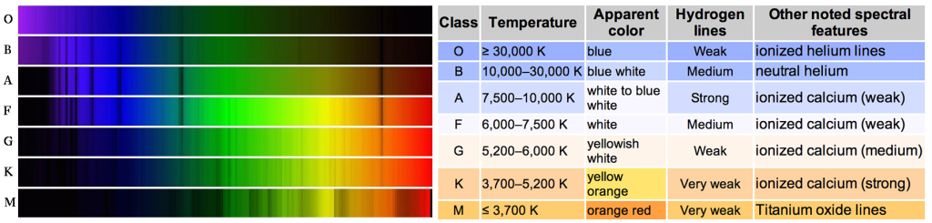 Alle righe di assorbimento presenti nello spettro della Stella, sono associate delle energie ben precise e questa mutua associazione ci consente di studiare la composizione chimica della fotosfera stellare. I primi studi condotti sul Sole dimostrarono che le righe di assorbimento osservate erano riconducibili ad elementi noti come l’Idrogeno, il Calcio, il Ferro ed altri elementi. Grazie a queste prime conferme, nel XIX nacque il primo schema dettagliato di classificazione spettrale ad opera di Padre Secchi. Ma il lavoro più importante fu svolto negli anni che vanno dal 1877 al 1919 presso l’Harvard College Observatory dove furono studiate migliaia di stelle e fu ideata la classificazione ancora oggi in uso e nota con le lettere O, B, A, F, G, K, M (classificazione di Miss Cannon). La sequenza è tale per cui si passa da stelle che mostrano poche righe di assorbimento, a stelle che ne mostrano molte e spesso associate alla comparsa di bande. Successivamente si provò che la stessa suddivisione era anche una classificazione di temperatura decrescente come schematizzato nell’immagine che segue.