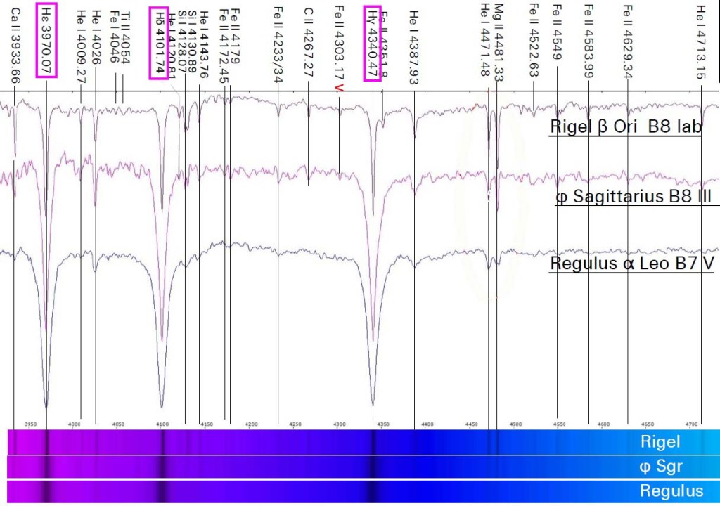 Questo tipo di classificazione più fine è anche una classificazione di luminosità in quanto una stella nana, a causa della minore superficie, è tipicamente meno luminosa di una stella gigante o supergigante (quest’ultima indicata dal numero romano “I”). Un rapido riscontro lo si può intuire dalla larghezza delle righe Hγ, Hδ e Hε riportate nell’immagine successiva.