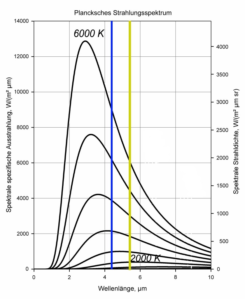 Le curve mostrano un massimo di emissione a diverse lunghezze d’onda, in particolare in corrispondenza del blu, o del giallo oppure del rosso in funzione della temperatura decrescente. Servendoci di questa legge e partendo dall’assunto che il modello del corpo nero descrive molto bene il comportamento della Stella,, possiamo provare a determinare la temperatura della superficie della Stella. Consideriamo due curve di emissione di una sorgente e indichiamo su ciascuna i punti relativi all’emissione nel blu e nel giallo. Il rapporto blu/giallo delle relative intensità emesse a queste due lunghezze d’onda, è diverso per ciascuna delle due curve considerate. Dalla curva di Planck in figura si deduce che ad un rapporto blu/giallo più alto, corrisponde una temperatura più alta. Possiamo, quindi, valutare la temperatura di una Stella misurando l’intensità dello spettro di emissione a due diverse lunghezze d’onda. La temperatura misurata con questo metodo si chiama temperatura di colore