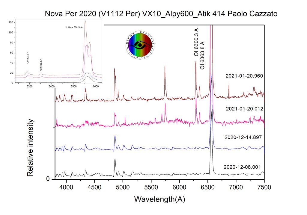 Confronto di spettri acquisiti in circa quaranta giorni nei quali si nota un’evoluzione della riga H-Alpha fino ad essere visibile uno sdoppiamento della riga e la comparsa delle righe dell’OI