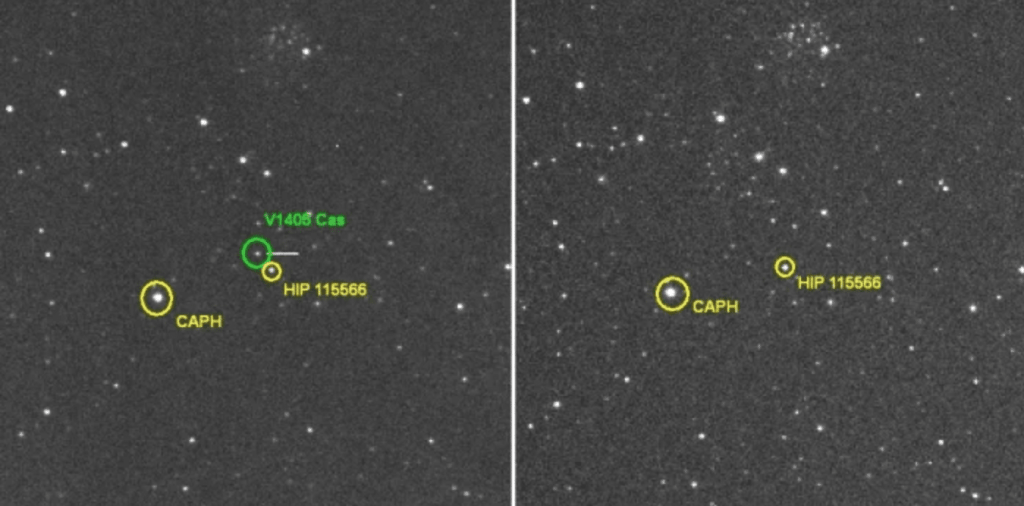 Nova Cas 2021 o V1405 Cas, scoperta il 18 marzo 2021 nella costellazione di Cassiopea da un Giapponese quando brillava di magnitudine 9.6. Ha incrementato la propria luminosità in 24 ora fino alla 7.8 e ha raggiuto il suo massimo il 9 maggio quando brillava di mag 5.5