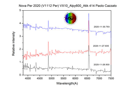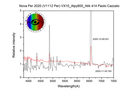 Confronto della Nova ripresa dalla “nascita” con la prima fase di incremento di luminosità dove non sono ancora presenti le linee emissive caratteristiche del fenomeno. Circa 10 giorni dopo la prima ripresa, la riga più prominente, l’H_Alpha, mostra un allargamento che stima una velocità di espansione del gas di circa 2540 Km/s