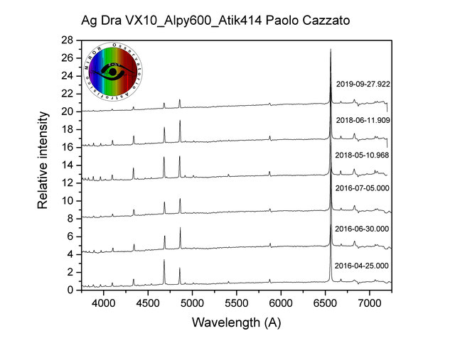 Gli outburst maggiori si verificano in intervalli di 12-15 anni (nel 1936, 1951, 1966, 1980, 1994 e 2006), e sono solitamente seguiti da outburst di minore entità in intervalli di circa 1 anno (Hric et al. 2014) ma l’ ultima attività di AG Dra è stata confermata nell’aprile 2016 in cui si è osservata una variazione di magnitudine da 9.7 mag il 7 Aprile, a 9.21 mag il 24 Aprile.