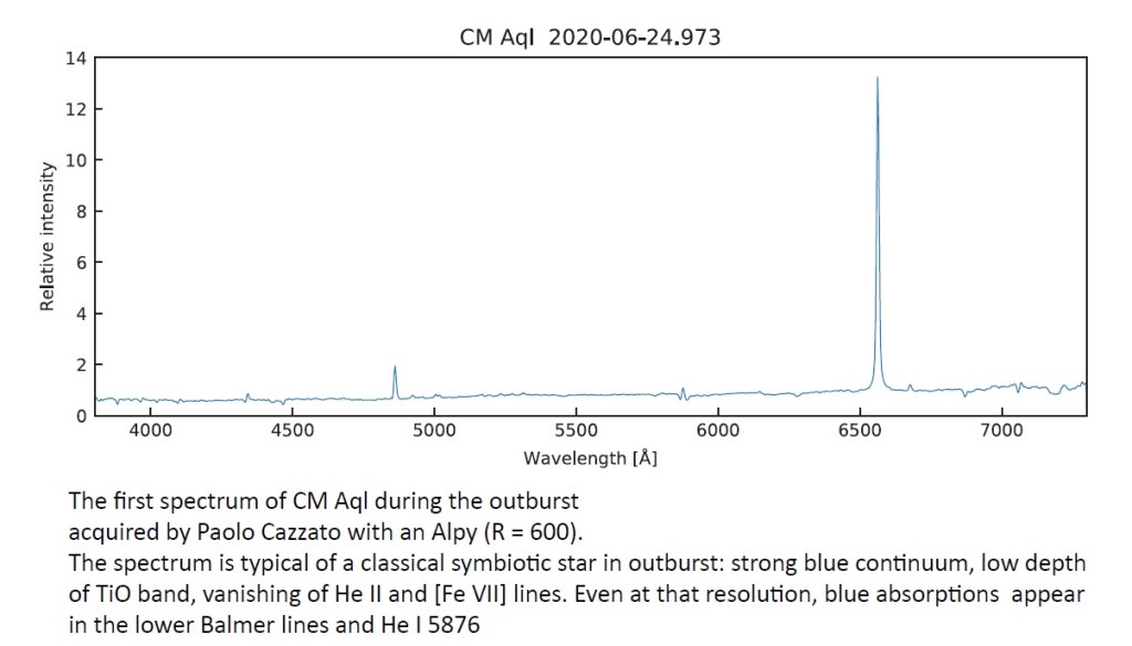 CM Aql è una stella simbiotica poco studiata che ospita una gigante di classe spettrale M2. Il 28 Febbraio 2020, è stato catturato un outburst da Gaia. Gaia è un’ambiziosa missione finalizzata a tracciare una mappa tridimensionale della nostra Galassia, la Via Lattea, rivelandone la composizione, la formazione e l’evoluzione (ESA)